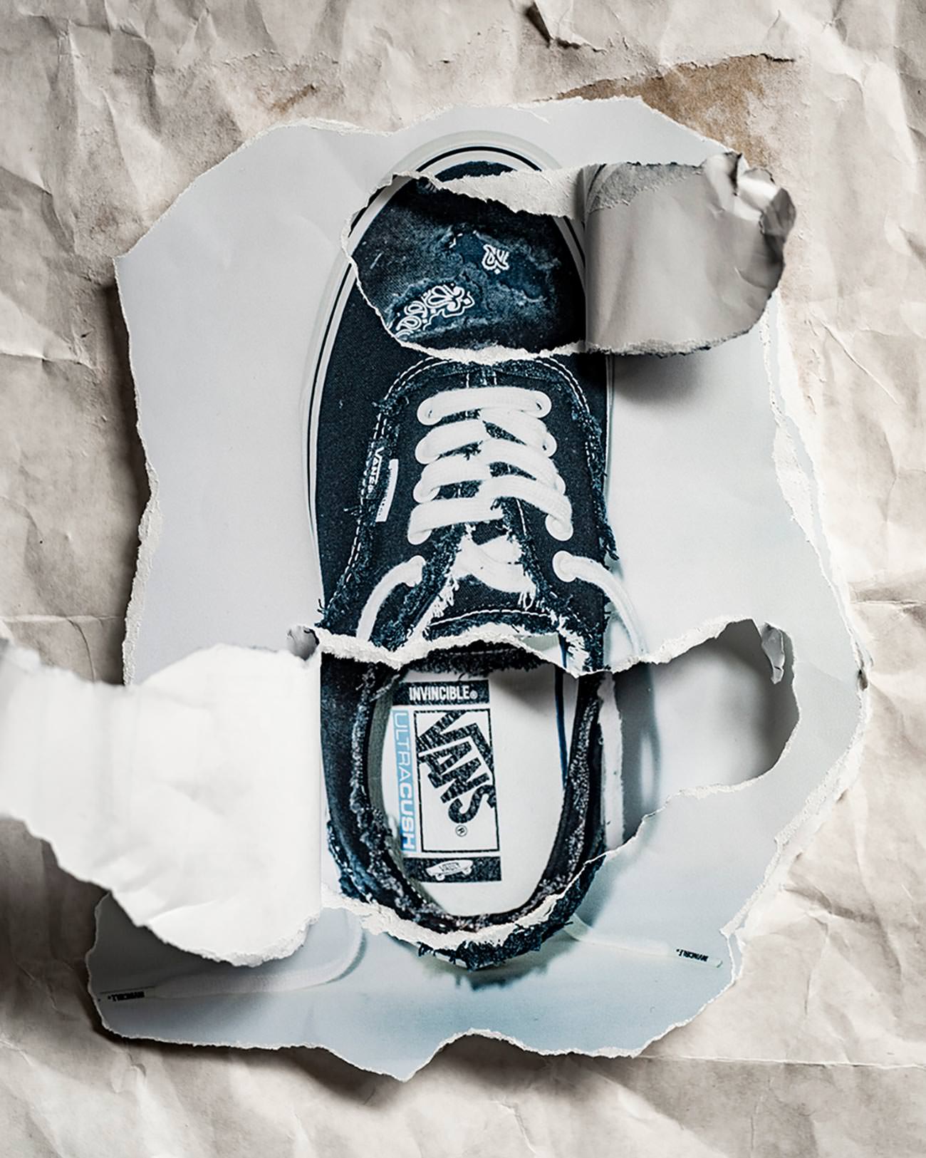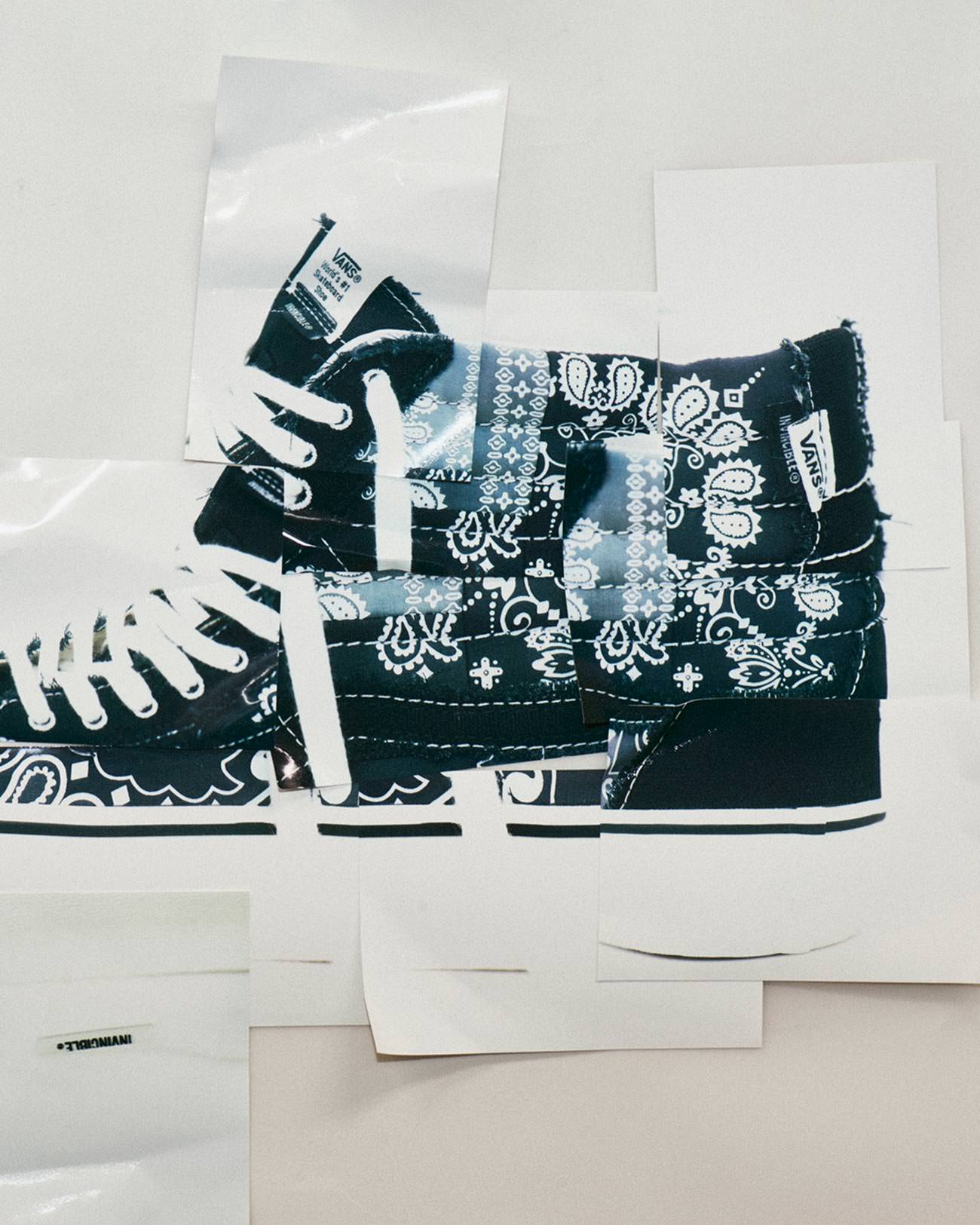 INVINCIBLE® has become a culture initiative in the region and has developed a well-established style through multiple collaborations with various brands. Looking through archive photography featuring aged and torn, skated-in Vans shoes and inspired by Vans’ heritage in skateboarding, art, music, and California street culture, INVINCIBLE® presents a collection featuring a paisley pattern executed with patchwork.