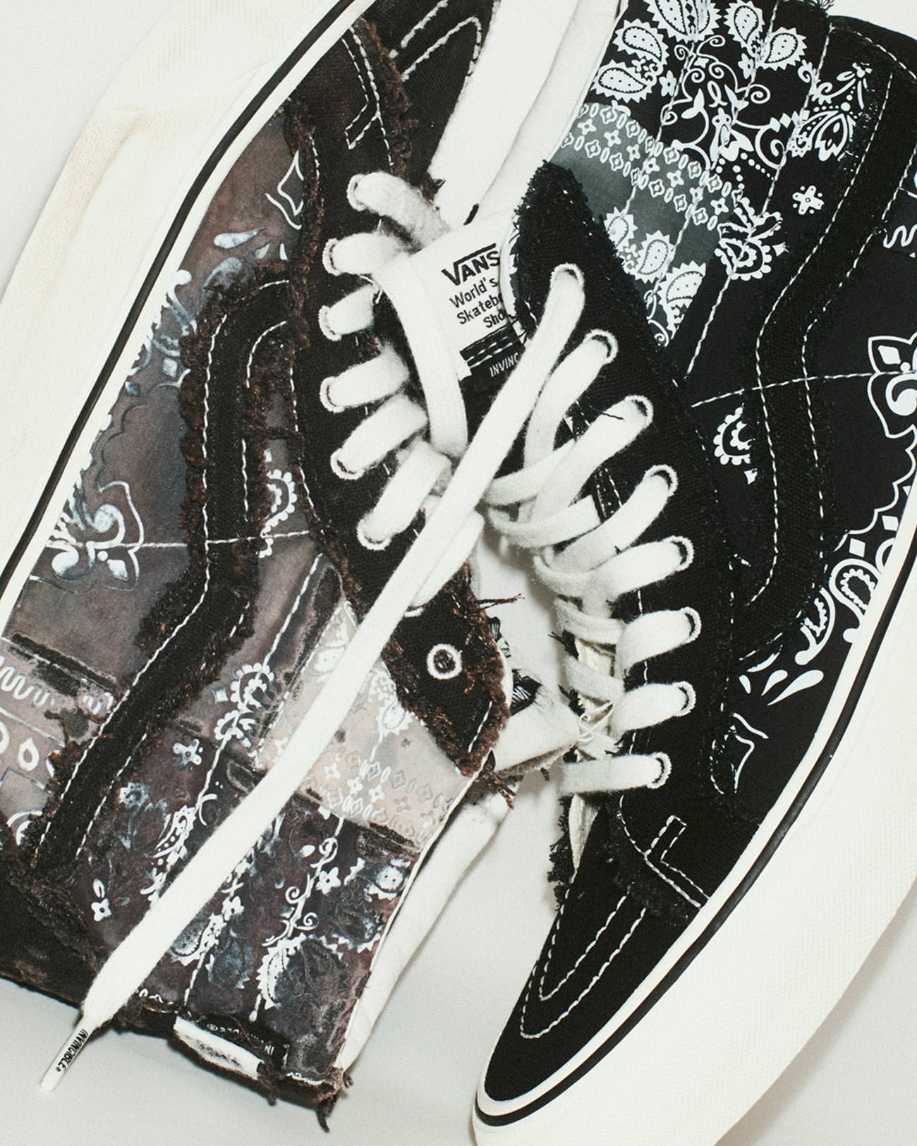 In this collection, the Vans Authentic is presented in black, but upon wear and tear, or a few meets and greets with the griptape, reveals an INVINCIBLE® and Vans monogram and a truly individual pair of shoes for the owner. The Sk8-Hi releases in a patchwork of black and white paisley monograms. Both silhouettes come with slightly distressed treatment throughout the upper, paying tribute to skateboarding and the process of a skater’s “gnarly” growth.