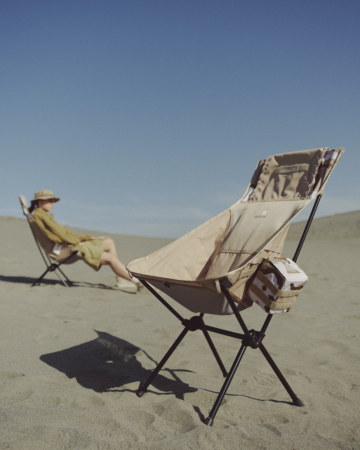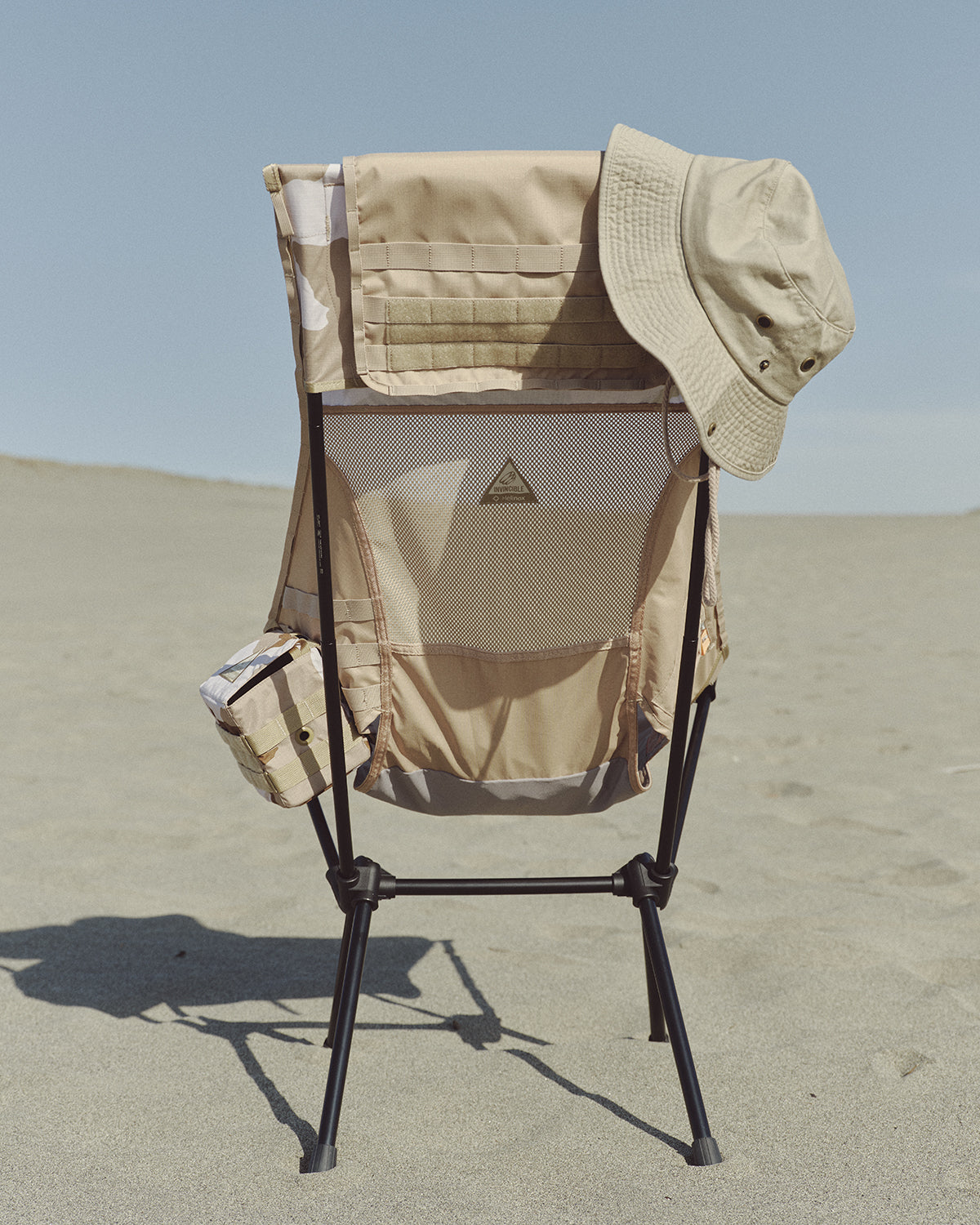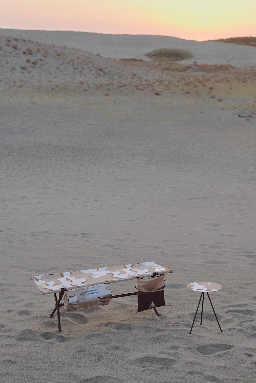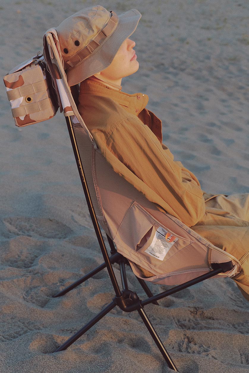 NVINCIBLE® remains steadfast in its commitment to pushing boundariesand redefining fashion trends through its collaboration with Helinox. As adedicated outdoor gear company, Helinox® continues to be a pioneer in theoutdoor industry, infusing expertise and passion into every product. Theyinvented the first ultra-lightweight chairs that are easy to assemble,lightweight, and portable. These groundbreaking chairs have receivedaccolades such as the prestigious Korean ISPO Equipment Award and theillustrious German Red Dot Design Award. Helinox consistently enhances itsexceptional products by partnering with global brands, adding trendyelements and making it the preferred choice for outdoor enthusiasts andthose with a taste for aesthetics. The spirit of Helinox aligns with the corevalues of INVINCIBLE®’s past collaborations, creating an opportunity for asecond crossover in Helinox’s immensely popular Tactical collection.The desert camoue print is inspired by the hidden patterns found inunique desert landscapes. INVINCIBLE® captures these concealed prints and patterns as design inspiration, showcasing their consistentlyunderstated yet impressive presence. The highlight of the collaboration is theTactical Sunset Chair, a signature Helinox product that is portable,lightweight, and easy to assemble. it features different designs on both sidesand incorporates the MOLLE system, allowing users to add accessories to thestraps as desired. The Tactical Bench showcases visually stunning desertcamouflage prints, with the INVINCIBLE® logo reminiscent of Velcro nametapes used in the military, seamlessly integrating functionality with outdoortrends. This collection also marks the first collaboration betweenINVINCIBLE® and Helinox on the Table O, exemplifying remarkable lifestylechoices for both indoor and outdoor use. The Tactical Table Side Storage isavailable in two sizes, S and XS, and can be attached to both the TacticalBench and Tactical Sunset Chair using MOLLE straps or even outdoorbackpacks, providing high functionality and customization options. TheTERG Sacoche Std. crossbody bag is constructed with Ripstop fabric, offeringincreased resistance to water, tearing, and ripping, making it an ideal choicefor camping, outdoor adventures, or city life.
